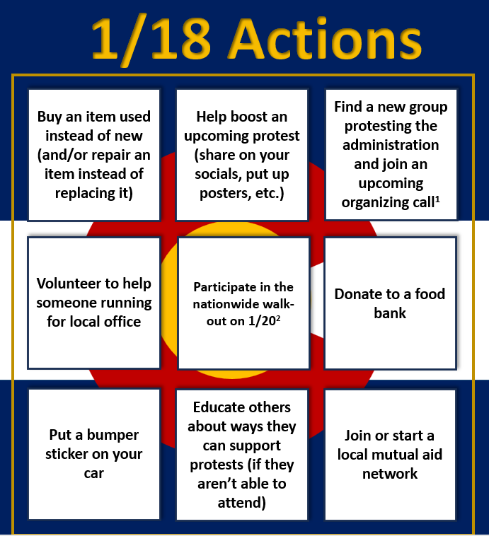 1/21: 9:00 - 11:00am - Denver Business Know Your Rights Canvass and Training (E. Evans Ave. near Havana St, SIGN UP to get address: https://www.mobilize.us/mobilize/event/879709/)